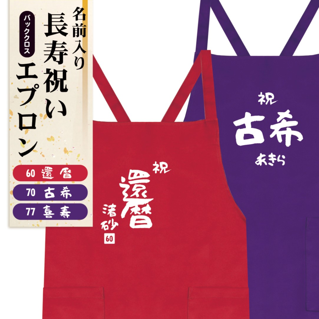 長寿祝いエプロン ポリエステル100% アラカン 還暦祝い 古希 喜寿 60歳 70歳 77歳 誕生日 胸当てエプロン バッククロス ラッピング資材同梱可 メール便可1