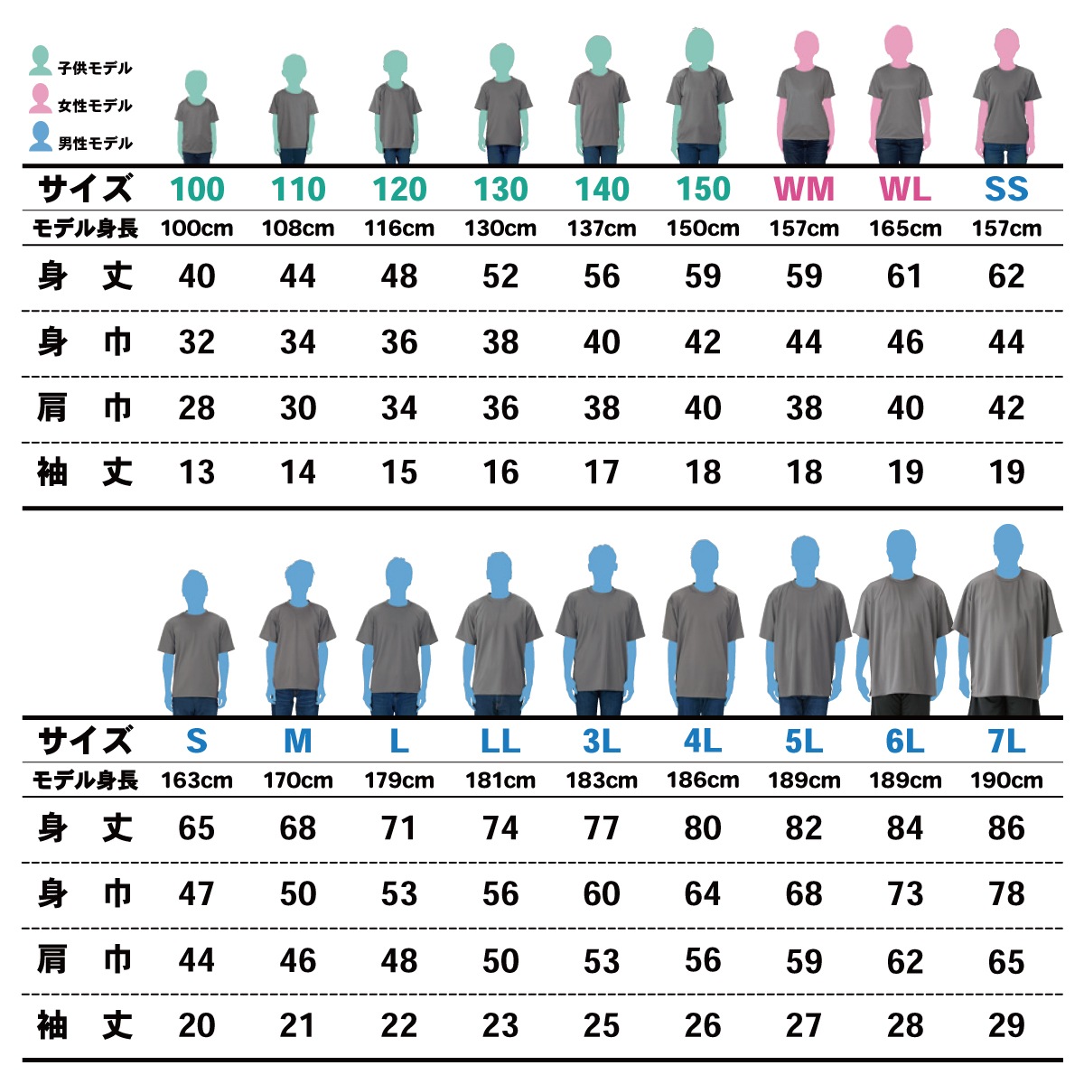 全18サイズ 《100》身丈:40/身巾:32/肩幅:28/袖丈:13 《110》身丈:44/身巾:34/肩幅:30/袖丈:14 《120》身丈:48/身巾:36/肩幅:34/袖丈:15 《130》身丈:52/身巾:38/肩幅:36/袖丈:16 《140》身丈:56/身巾:40/肩幅:38/袖丈:17 《150》身丈:59/身巾:42/肩幅:40/袖丈:18 《WM》身丈:59/身巾:44/肩幅:38/袖丈:18 《WL》身丈:61/身巾:46/肩幅:40/袖丈:19 《SS》身丈:62/身巾:44/肩幅:42/袖丈:19 《S》身丈:65/身巾:47/肩幅:44/袖丈:20 《M》身丈:68/身巾:50/肩幅:46/袖丈:21 《L》身丈:71/身巾:53/肩幅:48/袖丈:22 《LL》身丈:74/身巾:56/肩幅:50/袖丈:23 《3L》身丈:77/身巾:60/肩幅:53/袖丈:25 《4L》身丈:80/身巾:64/肩幅:56/袖丈:26 《5L》身丈:82/身巾:68/肩幅:59/袖丈:27 《6L》身丈:84/身巾:73/肩幅:62/袖丈:28 《7L》身丈:86/身巾:78/肩幅:65/袖丈:29 |