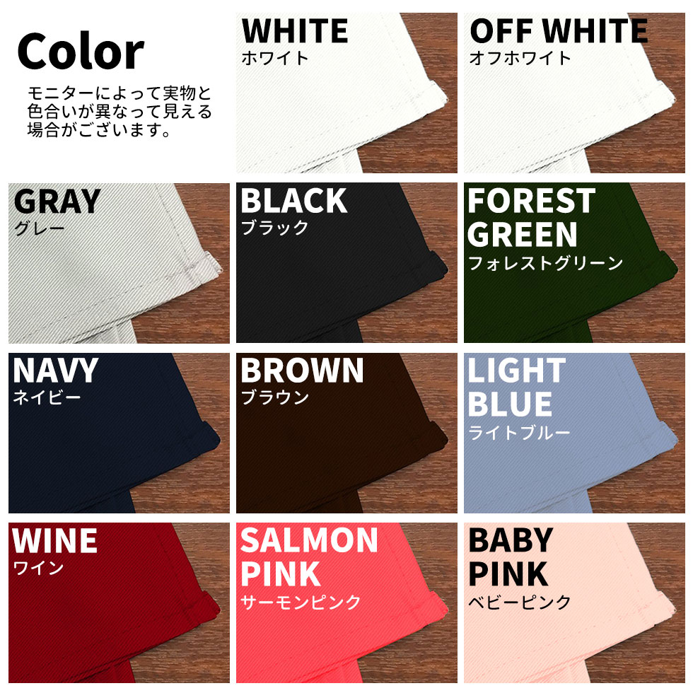 ホワイト・グレー・ブラック・ワイン・フォレストグリーン・ネイビー・ブラウン・ライトブルー・サーモンピンク・ベビーピンク