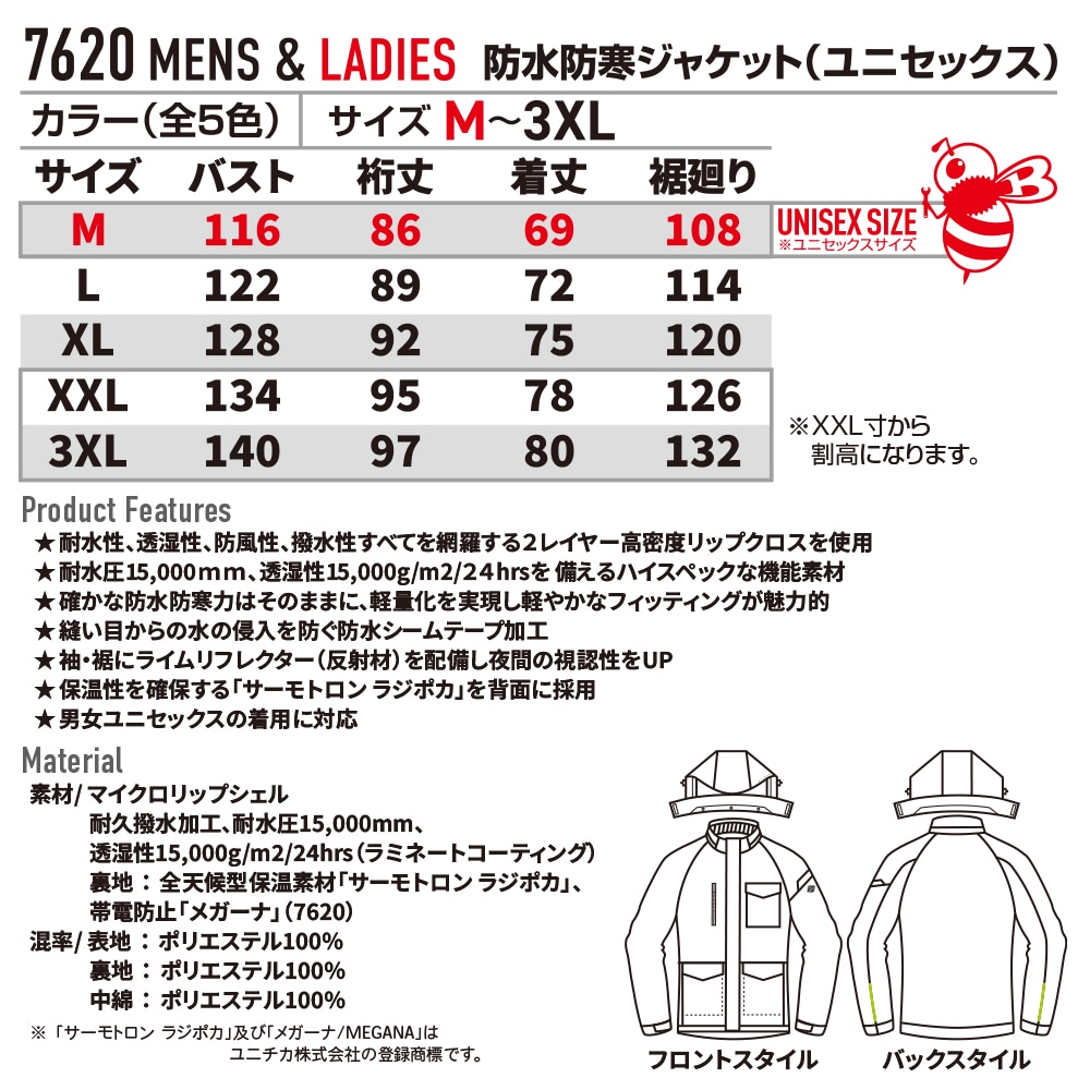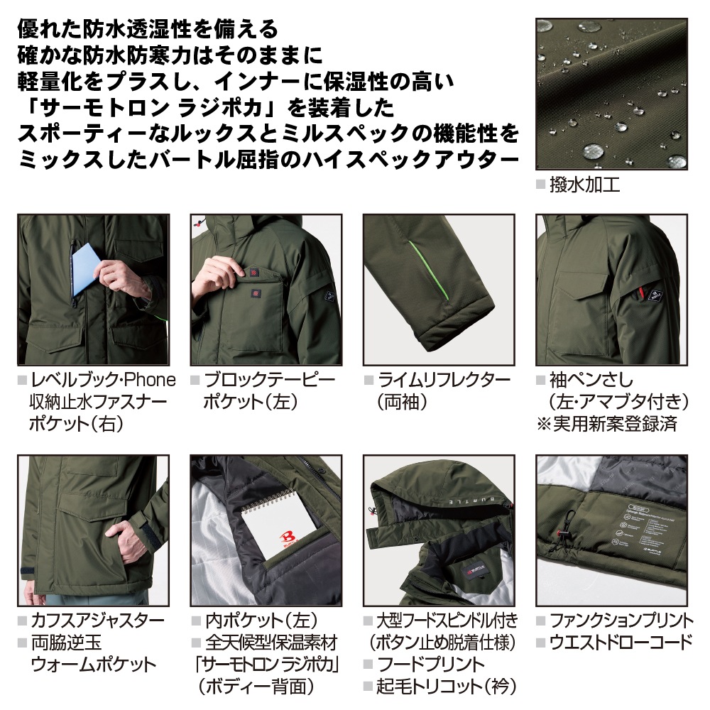 【素材】 マイクロリップシェル 耐久撥水加工、耐水圧15,000mm、 透湿性15,000g/m2/24hrs(ラミネートコーティング) 裏地:全天候型保温素材「サーモトロン ラジポカ」、 帯電防止「メガーナ」(7620) 【混率】 表地:ポリエステル100% 裏地:ポリエステル100% 中綿:ポリエステル100% ※「サーモトロンラジポカ」及び「メガーナ/MEGANA」はユニチカ株式会社の登録商標です。 | |